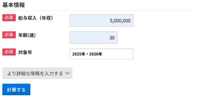 あなたの給与収入、年齢を入力して、「計算する」ボタンを押してください。