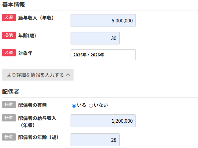 「配偶者の有無」で「いる」を選択し、配偶者の年収、年齢を入力し、下のほうの「計算する」ボタンを押します。
