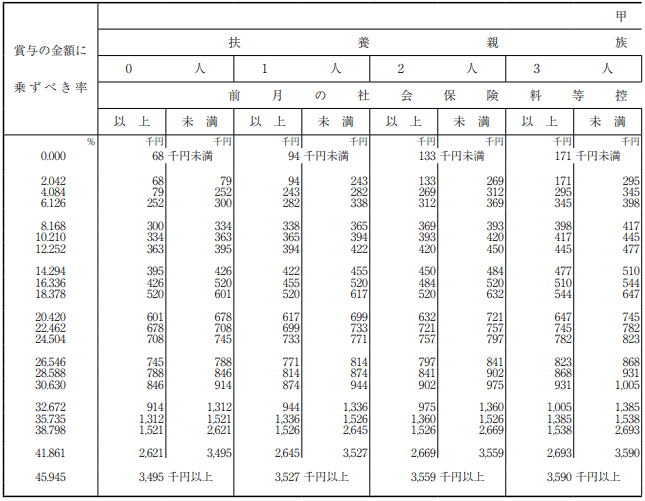 源泉徴収税率は、前月の給与から社会保険料を控除した後の金額と、扶養親族の人数で決まります。