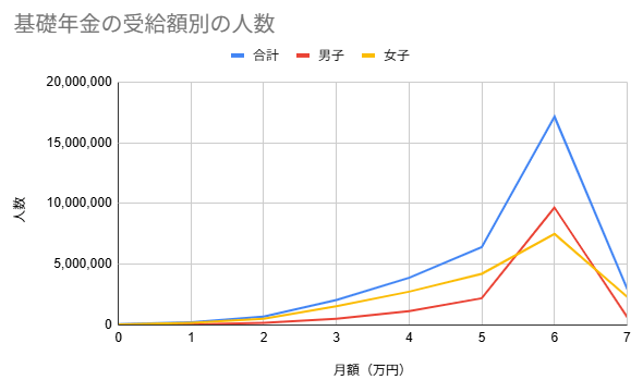 老齢基礎年金の月額の受給額別の人数をグラフにしてみました。