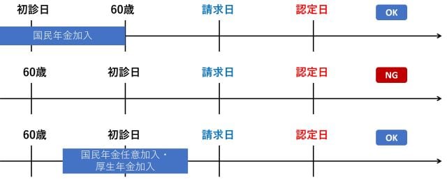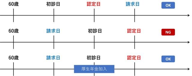 複雑なのは、繰り上げ請求日が初診日と障害認定日の間にある場合です。この場合、初診日に被保険者である(一般的には60歳より前)場合は障害年金をもらえますが、初診日が被保険者でない場合は障害年金をもらえません。